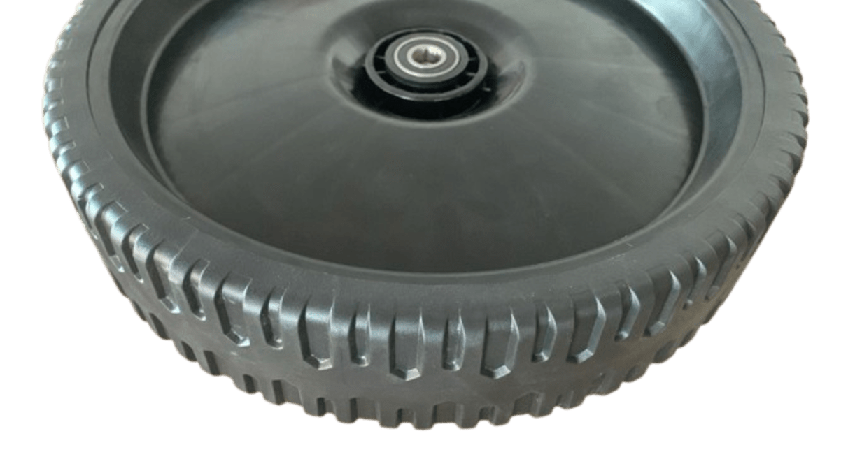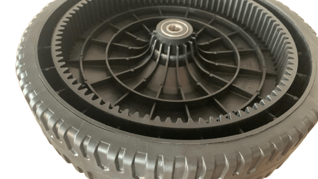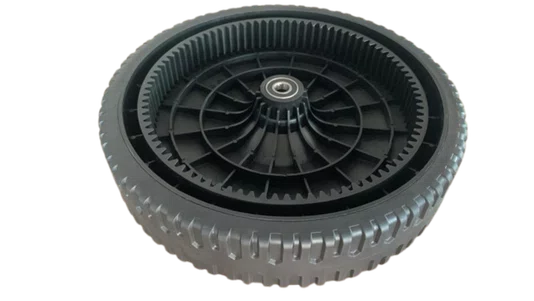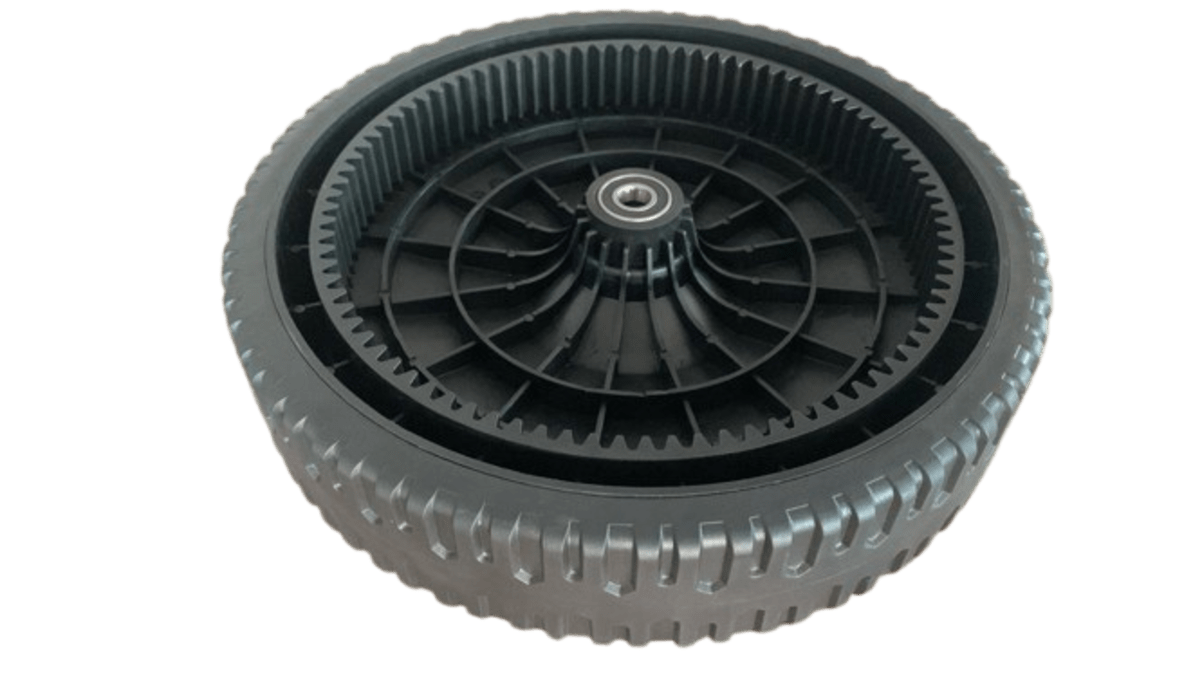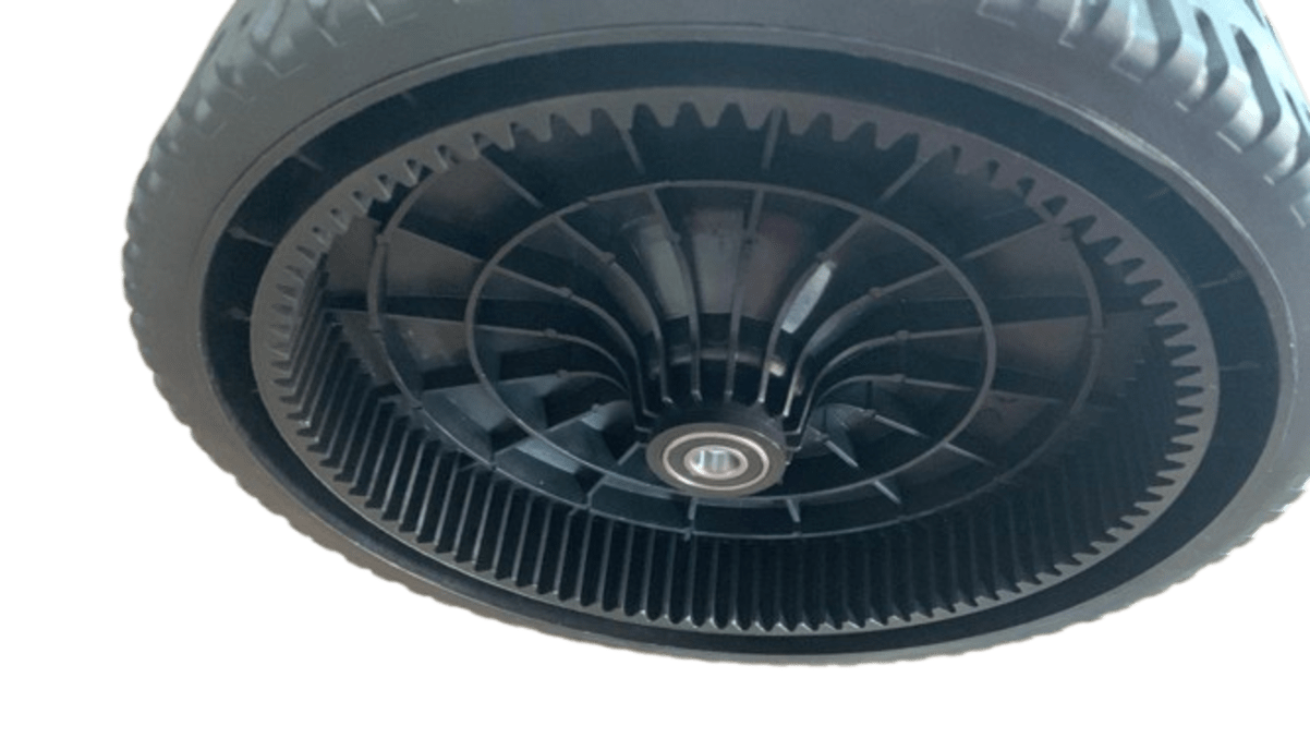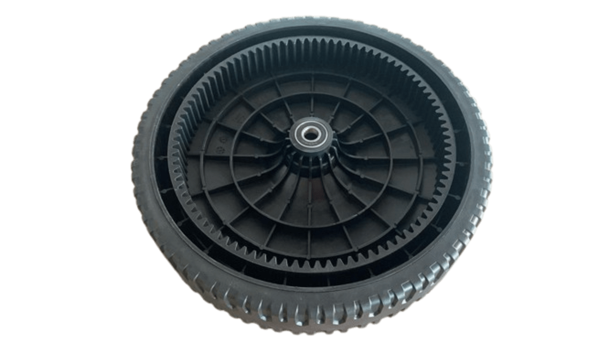As rodas para cortadores de grama são fabricadas em liga plástica de alta qualidade, que permite o uso em vários tipos de terrenos e com uma grande durabilidade. Possuem cremalheira para acionamento do pinhão de tração traseira da máquina.